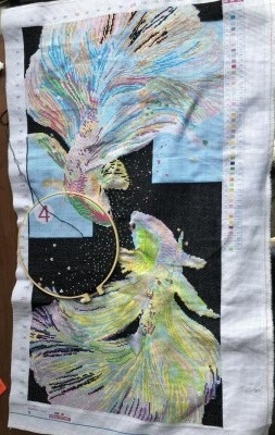 อุปกรณ์ : ผ้าปักสีขาว, เข็ม, ด้ายปักจีน, ผังลายสี